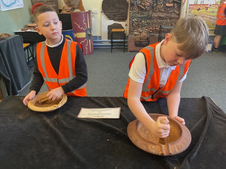 The day began with hands-on activities designed to reveal the routines and skills of Roman daily life. Pupils visited a reconstructed Roman kitchen, where they ground spices using traditional tools and discovered how food was prepared nearly two thousand years ago. They then tried creating their own mosaics, placing tiny tiles to build patterns inspired by archaeological finds.